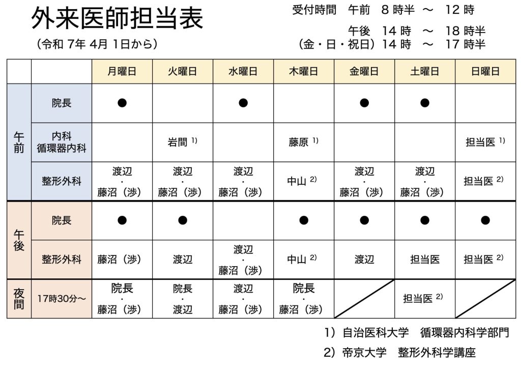 日曜日の内科・循環器内科、整形外科の担当医、その他休診・代診情報は
